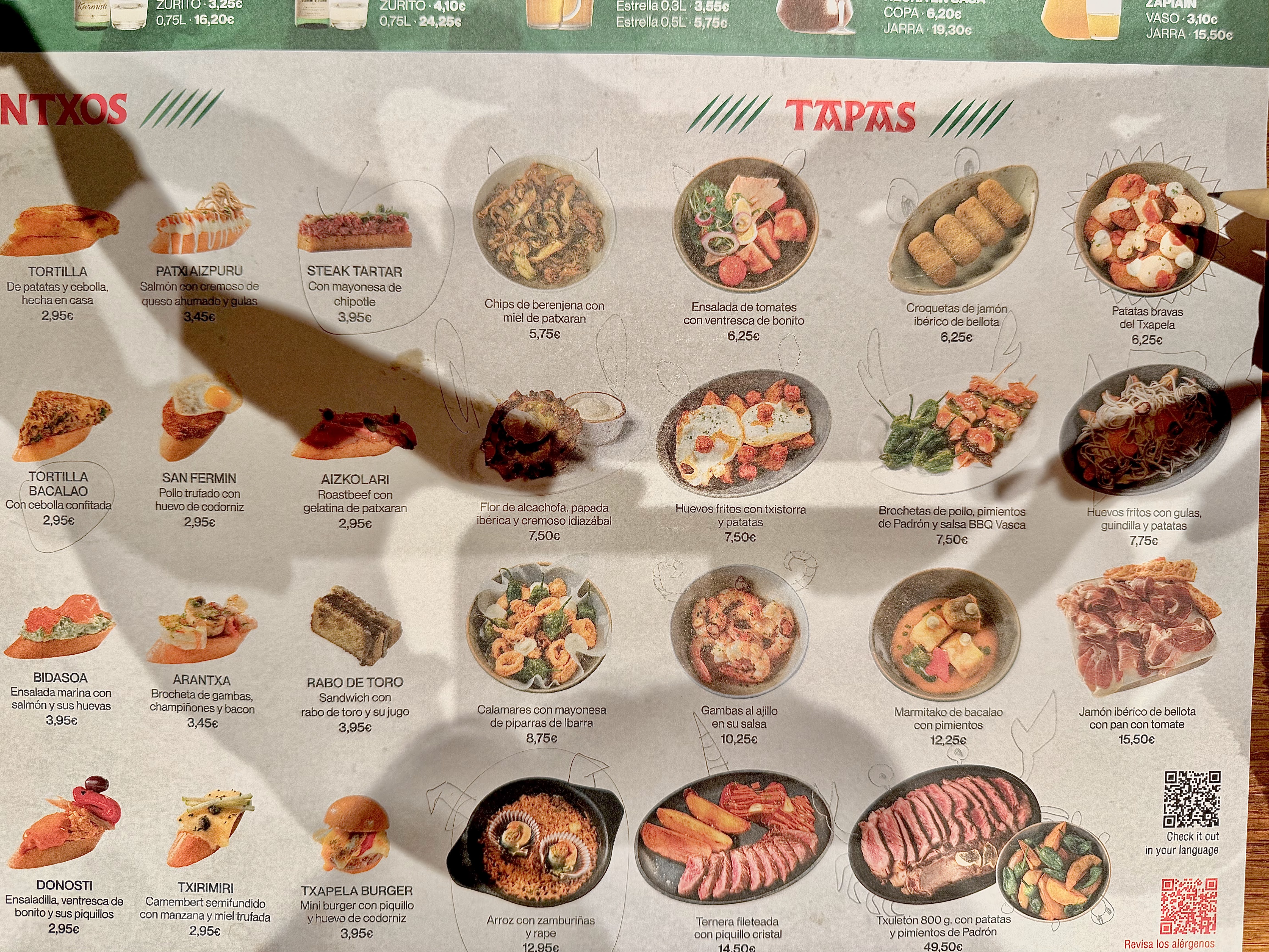 我們住的飯店旁Calle de la Montera街上有許多餐廳,身為西班牙文盲+英文能力不佳(雖然做了些功課但拿起印滿字的菜單依舊望洋興嘆)的人,十分推薦Txapela餐酒館,因為菜單上每項菜色都有照片,我甚至用鉛筆圈照片點餐:p